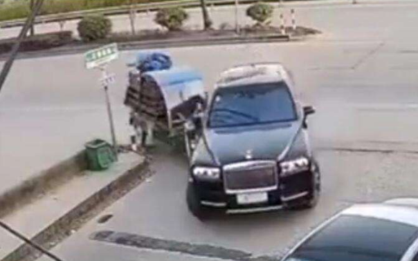 11月10日,在浙江余姚,路口的监控视频显示,一辆黑色劳斯莱斯行至路口时右转,后方一辆直行三轮车避让 https://bit.ly/3lnV4mV