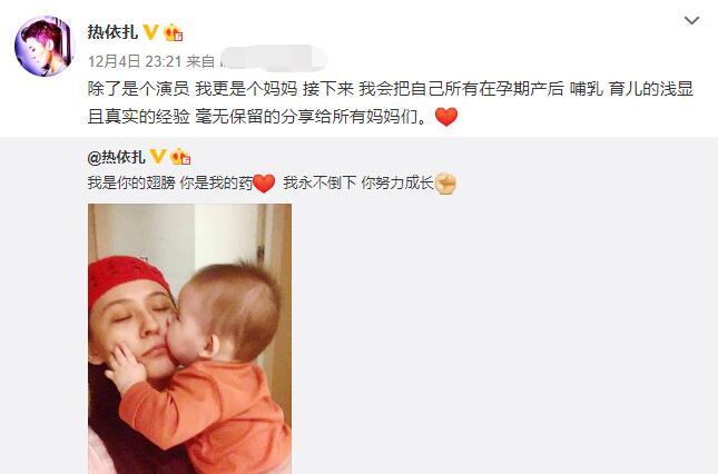 12月4日晚上,演员热依扎官宣了产女的消息,并晒出和女儿的亲密照,说:“我是你的翅膀,你是我的药”, https://bit.ly/33JZGx7