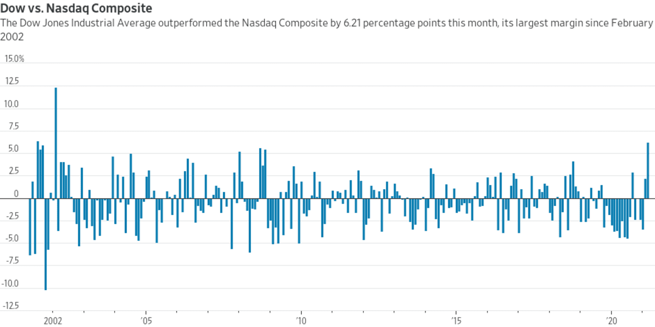 The Dow just beat the Nasdaq by the widest margin in a month since 2002. Here's how stocks tend to perform afterward - MarketWatch