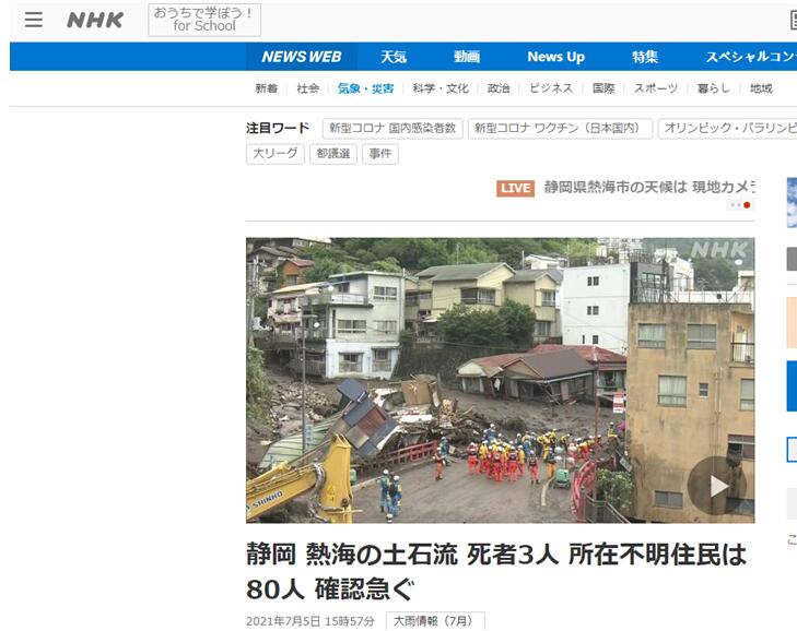 1. 日媒:日本静冈县泥石流灾害已致3人死亡,仍有80人下落不明  新浪网